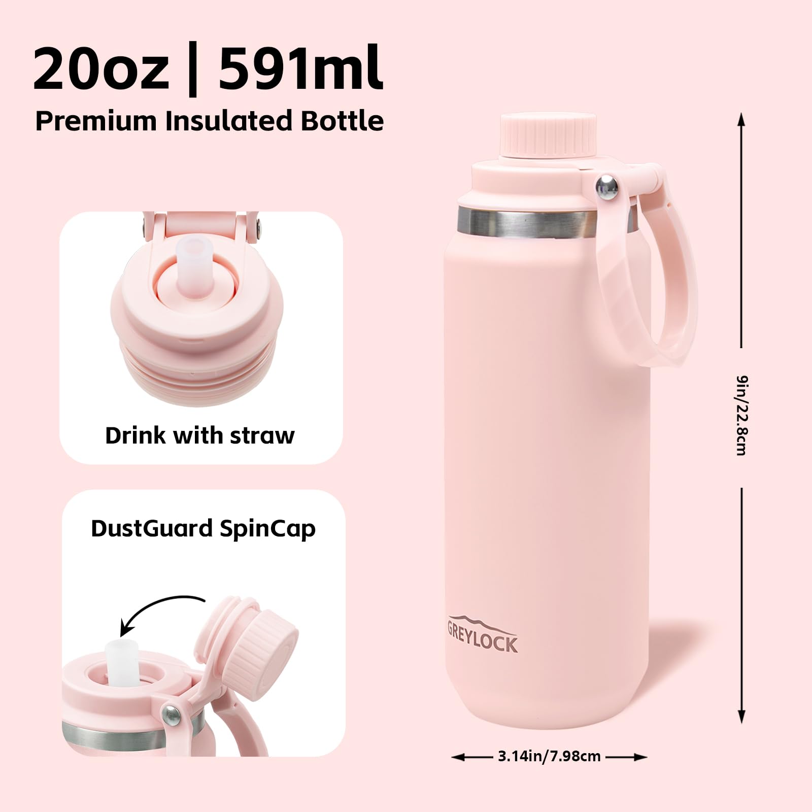 20 oz Greylock Insulated Stainless Steel Water Bottle with Straw Lid, Foldable Handle, Leak-Proof, Double-Wall Vacuum Insulation, Keeps Cold 24H, Light Pink