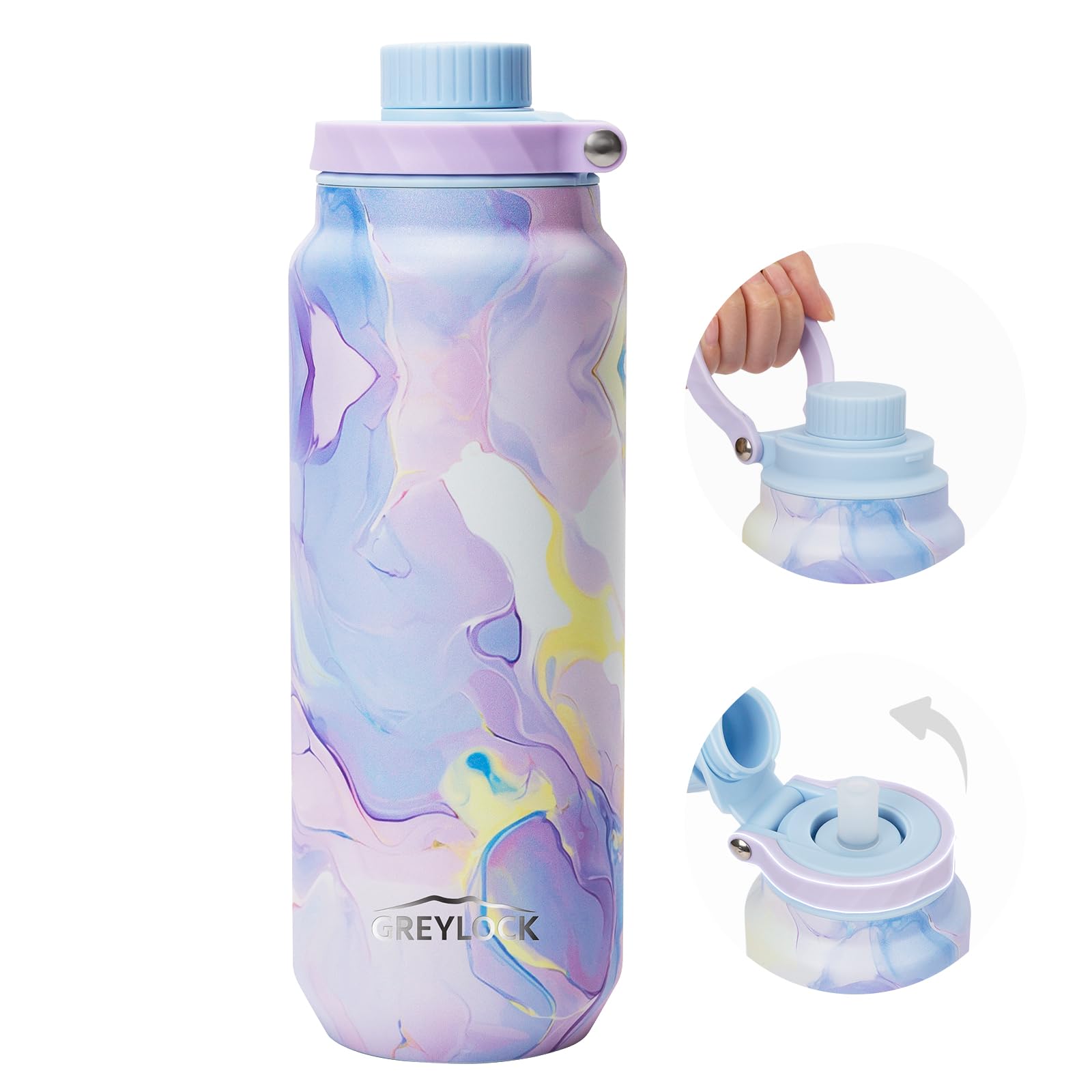 24 oz Greylock Insulated Stainless Steel Water Bottle with Straw Lid, Leak-Proof, Vacuum Flask, Keeps Cold & Hot 24H, Carry Handle, Silicone Spout, BPA-Free, Purple, Gym, Hiking, Travel