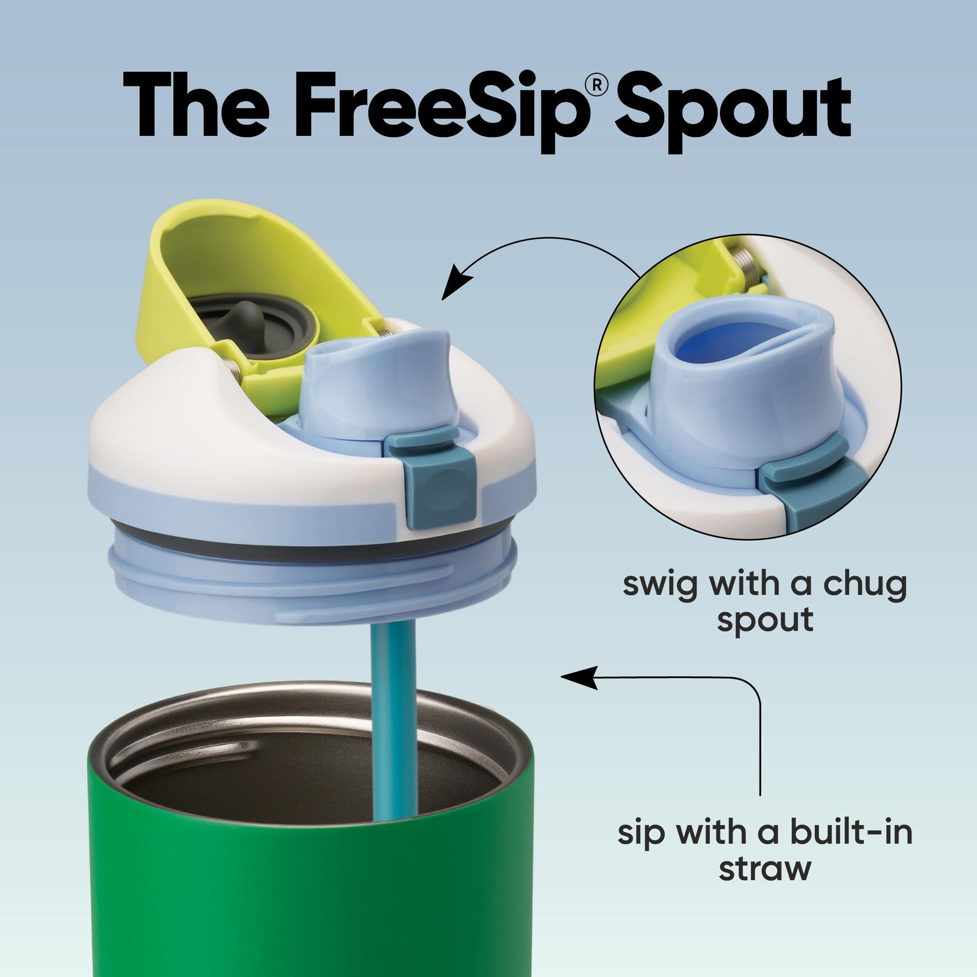 - The versatile 2-in-1 FreeSip spout lets you drink upright through a built-in straw or tilt back for a regular swig.