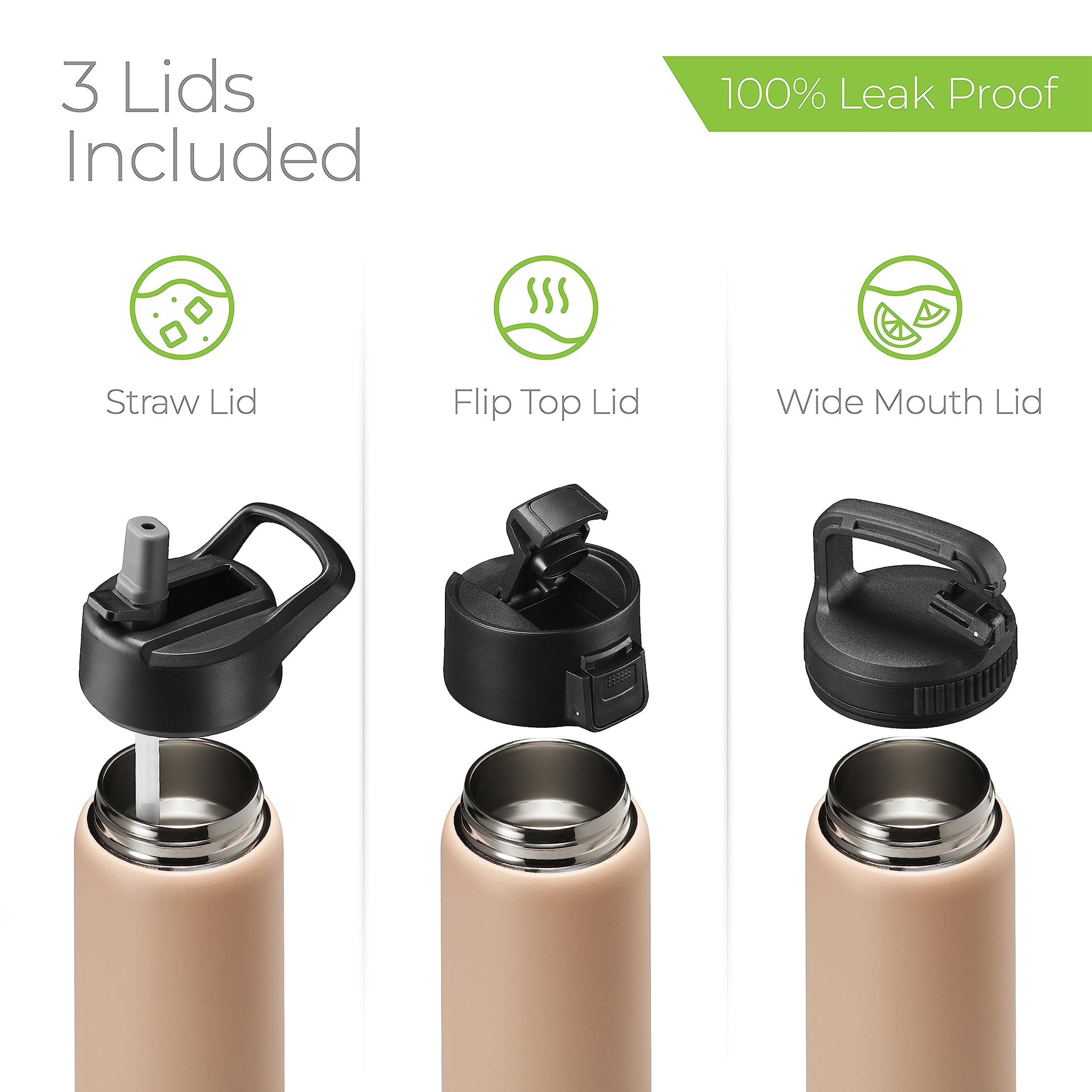 - 3 TYPE LIDS - Our drinking insulated water bottle comes with three individual lids to serve all your needs. Use the one with the mouthpiece for sipping hot drinks tee coffee etc…, the one with the straw for cold beverages, and the removable wide mouth lid for drinks containing ice or fruit.