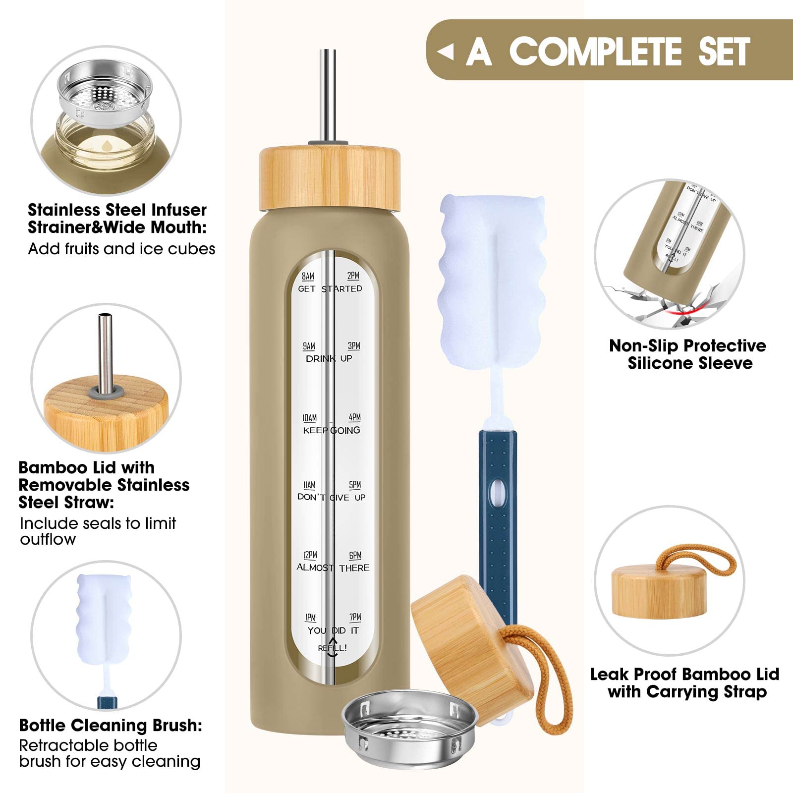 - Infuse Your Beverage - Use the stainless-steel infuser to strain fruits or herbs in our reusable glass water bottle 32oz with time marker for a delicious and healthy way to flavor your water. Silicone sleeve adds style and provides protection from slips and falls